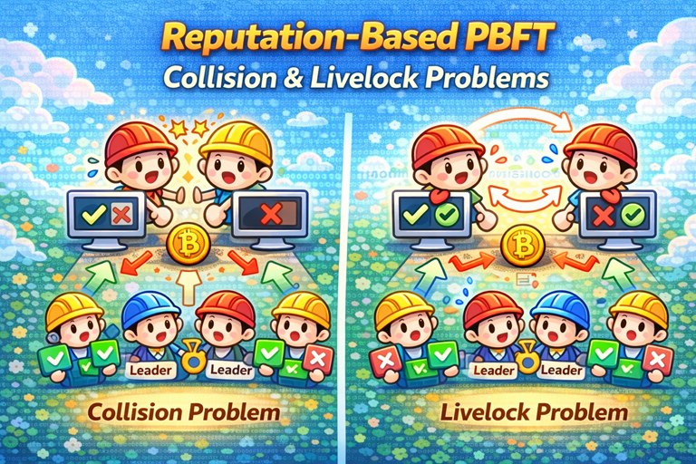 為提升PBFT類共識在實務環境中的效率與適應性,近年研究開始引入 reputation 機制,藉由節點歷史行為或表現評分來影響 leader 選擇與投票權重。然而,將 reputation 直接整合至 PBFT 流程亦引入新的系統性風險,特別是 collision 與 livelock 兩類問題。所謂 collision,指的是多個高 reputation 節點在 view change 或 leader selection 過程中反覆被選為候選主節點,導致提案衝突或決策資源集中,反而降低共識效率;而 livelock 則表現為系統雖未違反安全性假設,卻因 reputation 分佈僵化或回饋機制設計不當,使共識流程在多次 view change 中反覆循環,長時間無法完成決策。這類問題並非傳統 PBFT 威脅模型下的 Byzantine 行為,而是源自於 reputation 導向設計本身所引發的動態交互效應,現有多數工作仍缺乏對其成因與演化行為的結構化分析。因此,如何在引入 reputation 的同時避免 collision 與 livelock,並維持 PBFT 的安全性與活性,已成為 reputation-based PBFT 設計中亟待正視的核心研究議題。